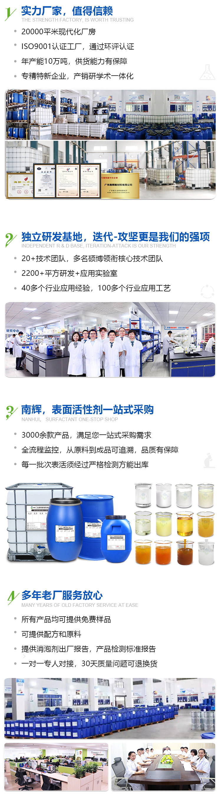 • 廣東南輝新材料有限公司,是一家致力于表面活性劑研發(fā)、生產(chǎn)、銷售為一體的國家高新技術(shù)企業(yè),擁有獨立的研發(fā)基地,主要研發(fā)產(chǎn)品有:乳化劑、滲透劑、勻染劑、司盤、吐溫、消泡劑等3000余款產(chǎn)品。南輝擁有20000平方米的現(xiàn)代化生產(chǎn)車間,年產(chǎn)能可達10萬噸。通過ISO9001:2015質(zhì)量管理體系認證,已獲得十余項不同產(chǎn)品的發(fā)明專利授權(quán),被評為廣東省"專精特新"企業(yè)。從2018年開始批量出口至俄羅斯、日本、馬來西亞、印度、秘魯?shù)葒遥殉蔀閲鴥?nèi)目前主要的表面活性劑生產(chǎn)廠家。